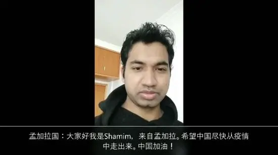 來自孟加拉國(guó)的Shamim,在浙江湖州留學(xué)和實(shí)習(xí)近一年了。對(duì)于中國(guó)奮力抗擊疫情的表現(xiàn),他深受感動(dòng)。日前,Shamim聯(lián)系了意大利、哈薩克斯坦、南非等12個(gè)國(guó)家的朋友,邀請(qǐng)他們一起錄制了一段視頻,鼓勵(lì)中國(guó)朋友們繼續(xù)堅(jiān)持,戰(zhàn)勝疫情?!跋嘈胖袊?guó)的朋友,看到這段視頻,會(huì)很高興。我們和他們一起加油!”他說。